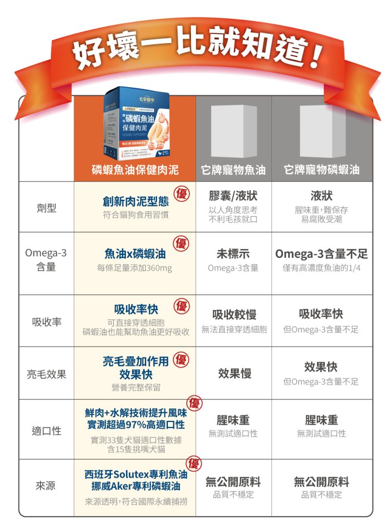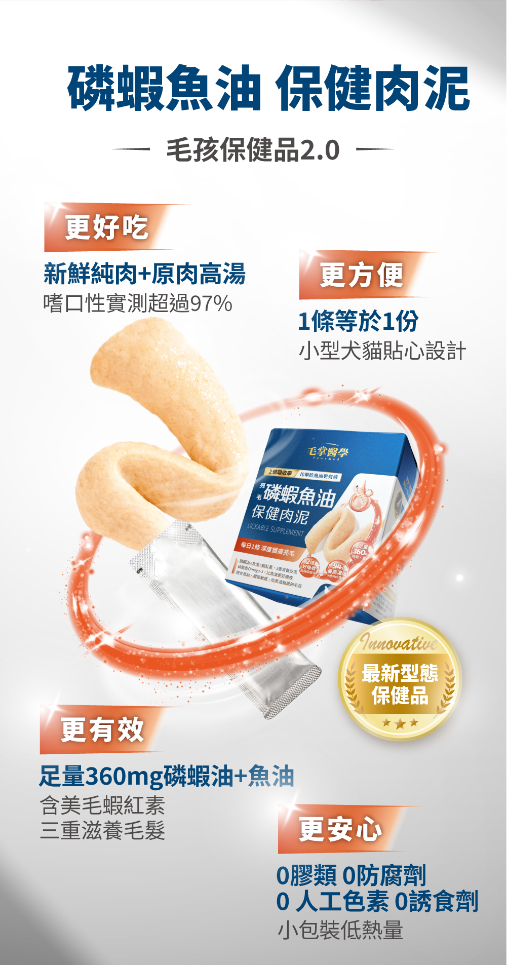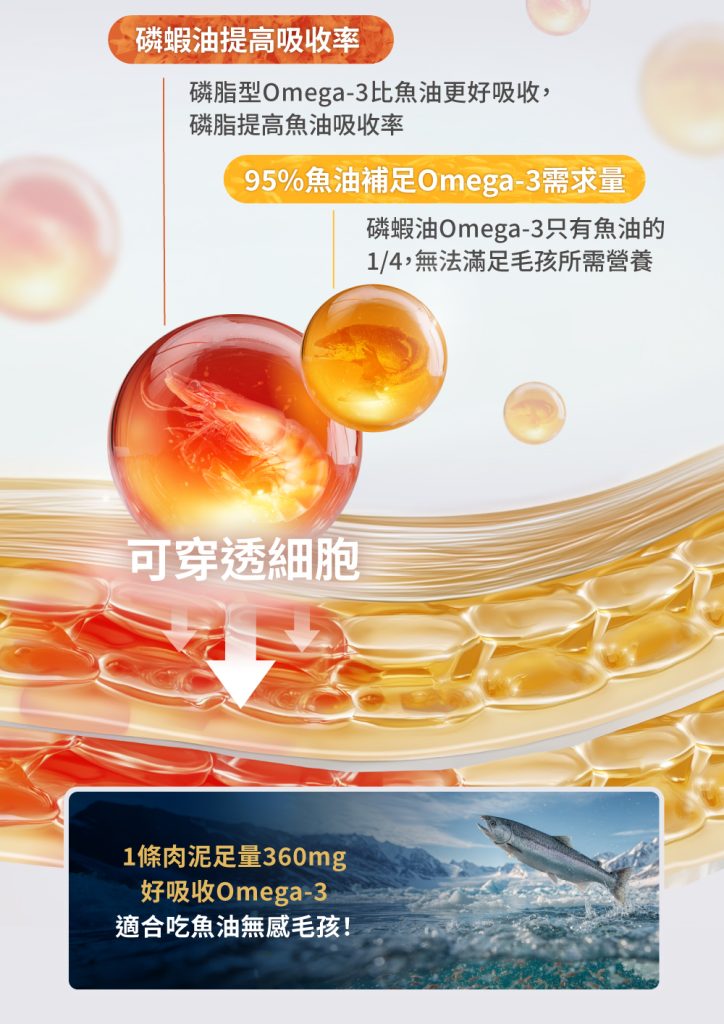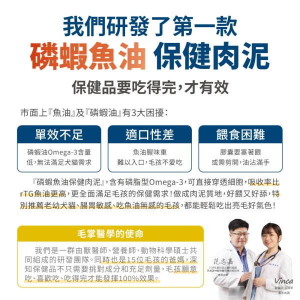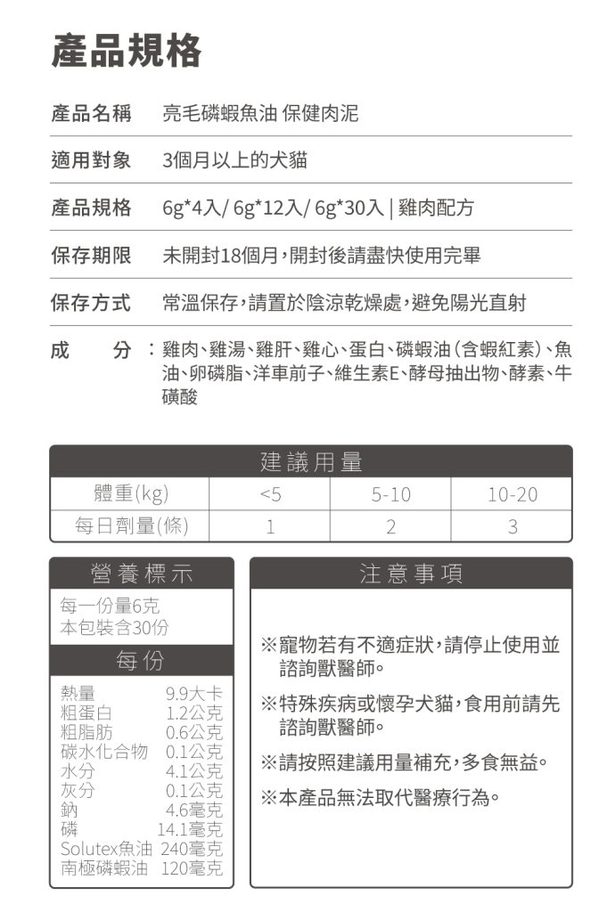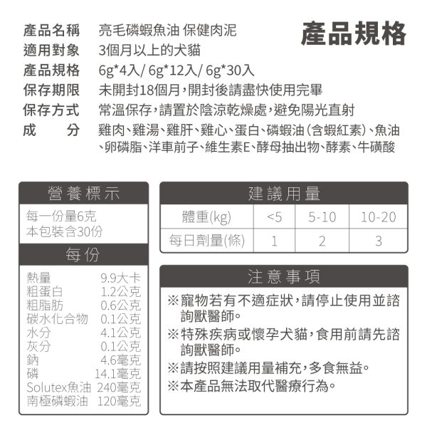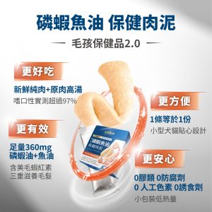 ☑ 1條肉泥=360mg磷蝦魚油 ☑ 比單吃魚油更有感亮毛 ☑ 含磷脂型Omega-3,比魚油好吸收 ☑ 含膽鹼及蝦紅素,助全保養 ☑ 無添加物,適口好不怕上癮,放心每天吃